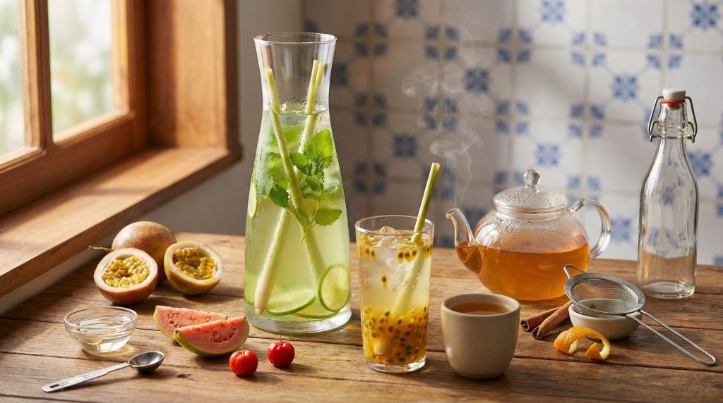 Como preparar: combine ervas ou cascas de frutas com água fria, deixe 8–12 horas na geladeira e coe. Ajuste proporção entre 1:10 e 1:5 (ingrediente:água) conforme intensidade desejada.