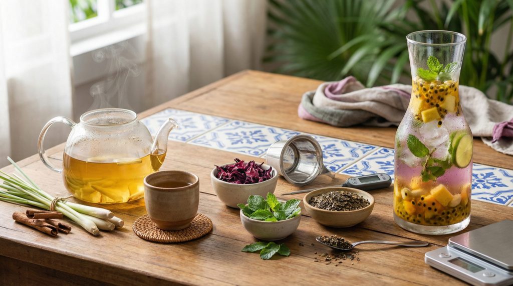Frutas como caju, cupuaçu e açaí podem entrar em infusões como polpa reduzida ou cascas secas. Use 10–20 g de polpa por litro para água aromatizada, ajustando doçura separadamente.