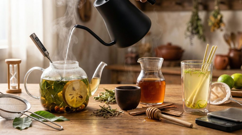 Use infusão a quente (80–95 °C) para folhas e chá-verde, e fervura breve para cascas e raízes. Ajuste tempo conforme a robustez da planta.