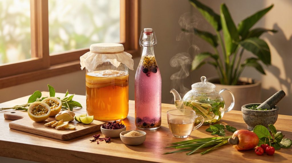 Para o preparo caseiro, o clima tropical do Brasil é um grande aliado, acelerando a fermentação e permitindo ciclos de produção mais rápidos do que em países frios. No entanto, é fundamental manter a higiene rigorosa dos utensílios e monitorar o pH da bebida para garantir a segurança alimentar. A criatividade entra na segunda fermentação, onde frutas como maracujá, jabuticaba e manga são adicionadas para saborizar e aumentar a carbonatação natural, criando um “refrigerante” vivo e nutritivo.