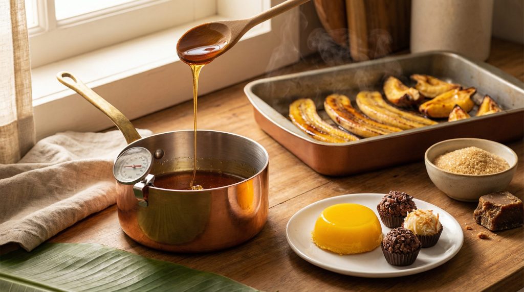 Em doces de corte como doce de leite e rapadura, a técnica de cocção lenta é crucial para textura sem depender só do açúcar.