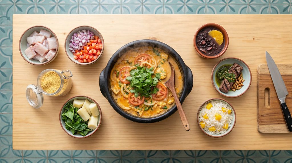Passo a passo rápido: refogue cebola, tomate e pimenta; adicione o peixe em postas pequenas; cubra com leite de coco e coentro; cozinhe por 12–15 minutos. Essa versão reduz tempo e conserva o perfil aromático.