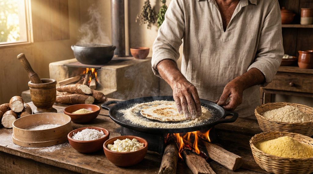 A produção de farinha envolve prensagem, decantação e secagem da massa de mandioca. Cada etapa — desde o uso do pilão até a gradação na peneira — define a textura final e o uso culinário da farinha.